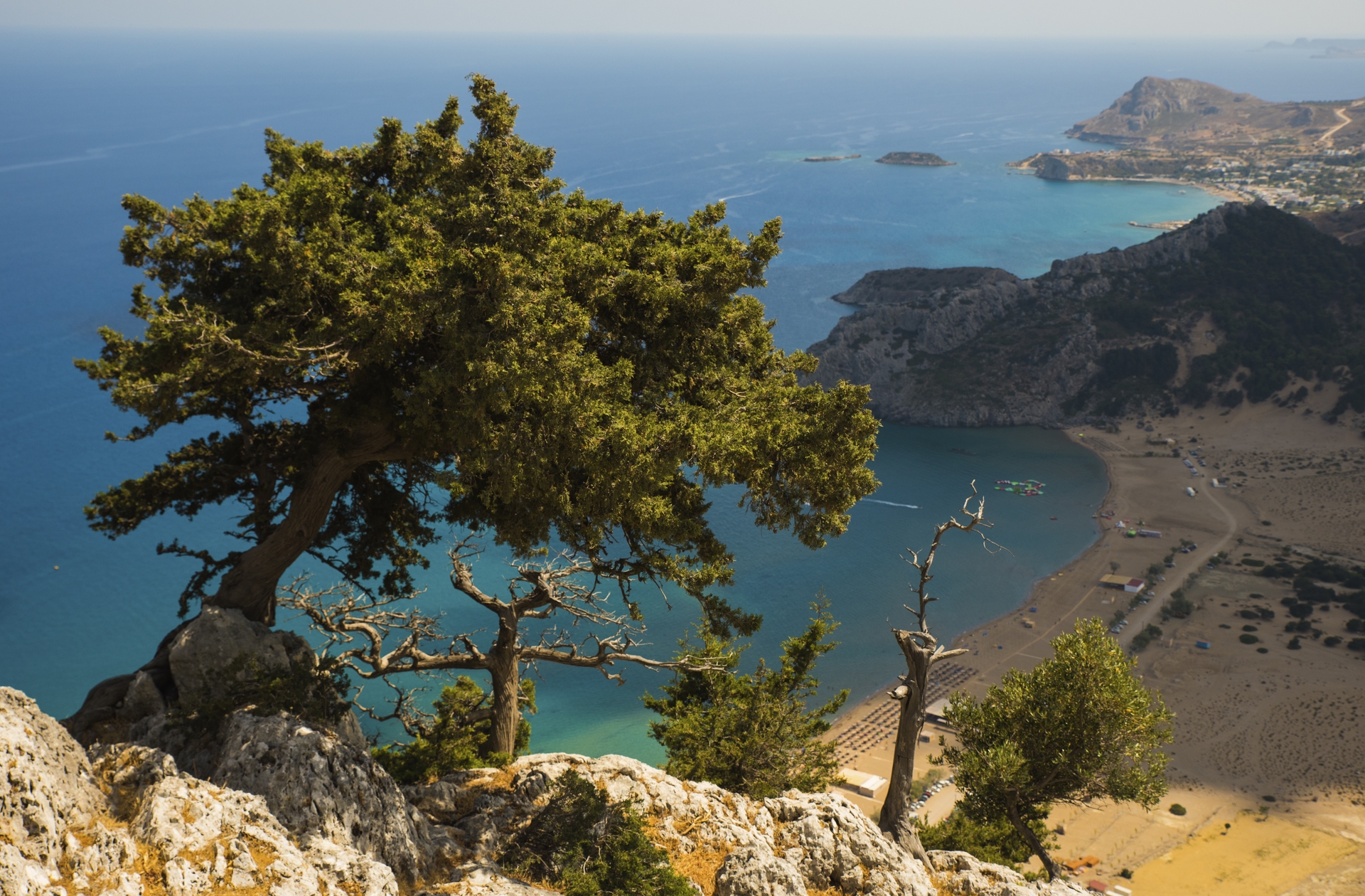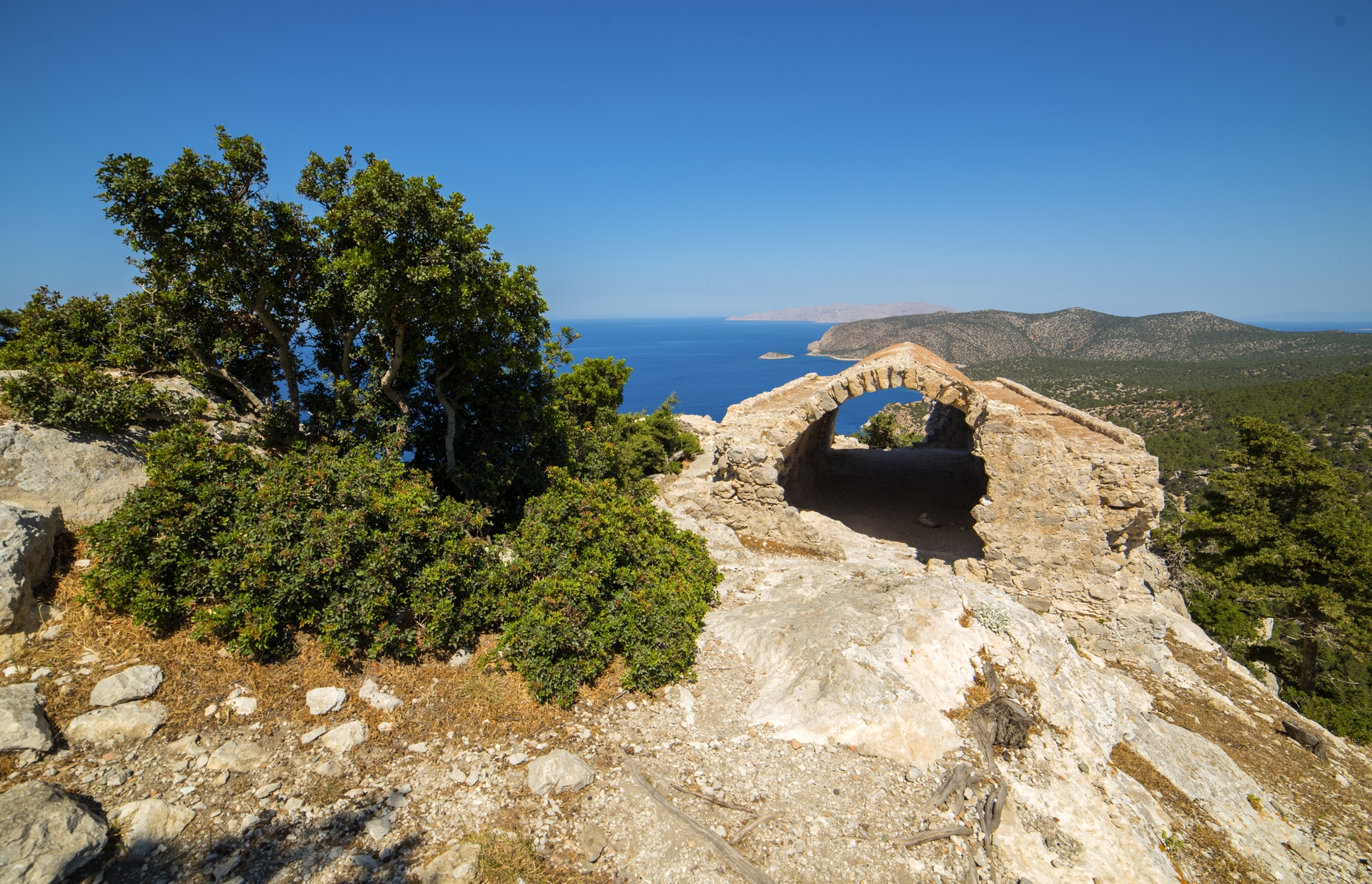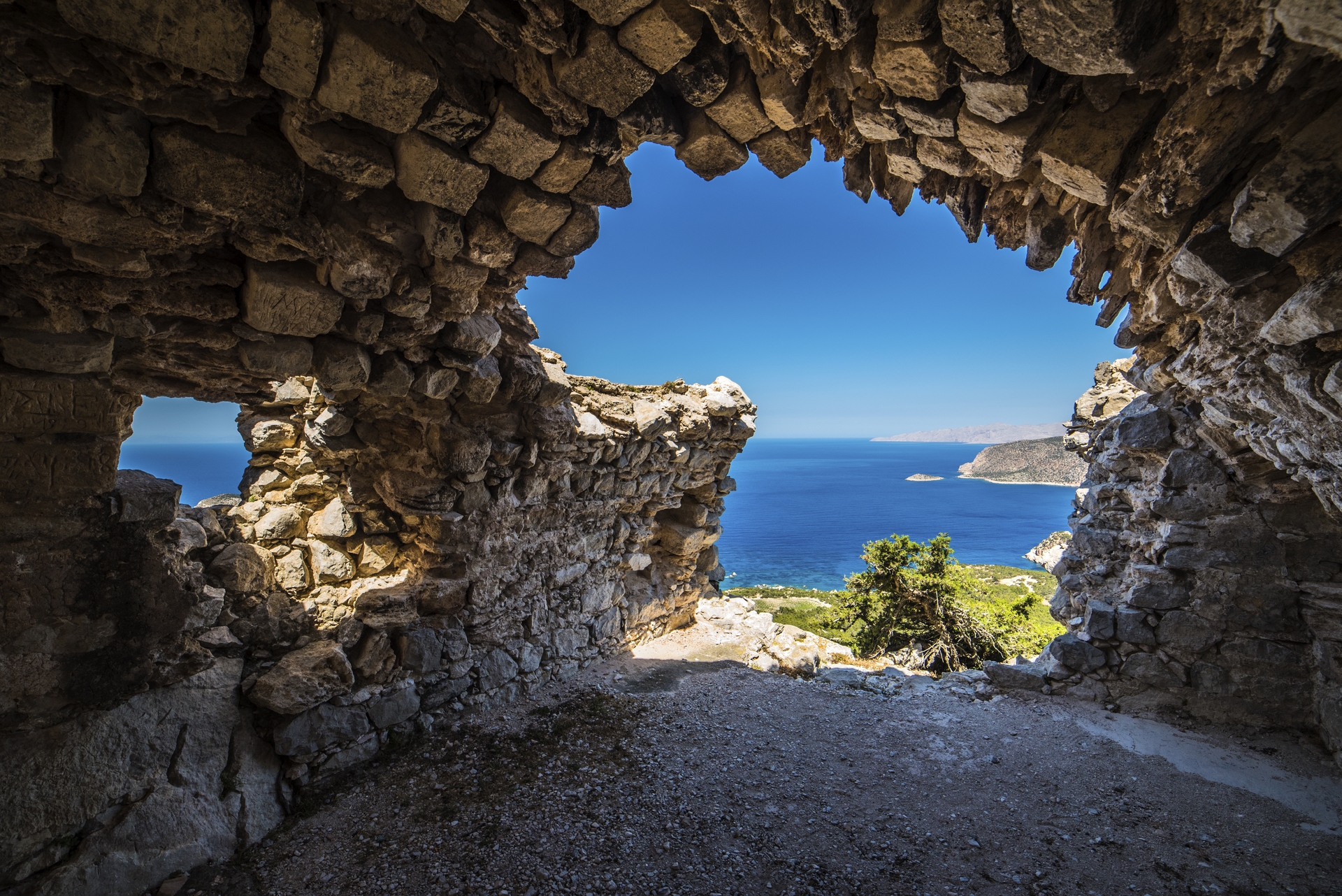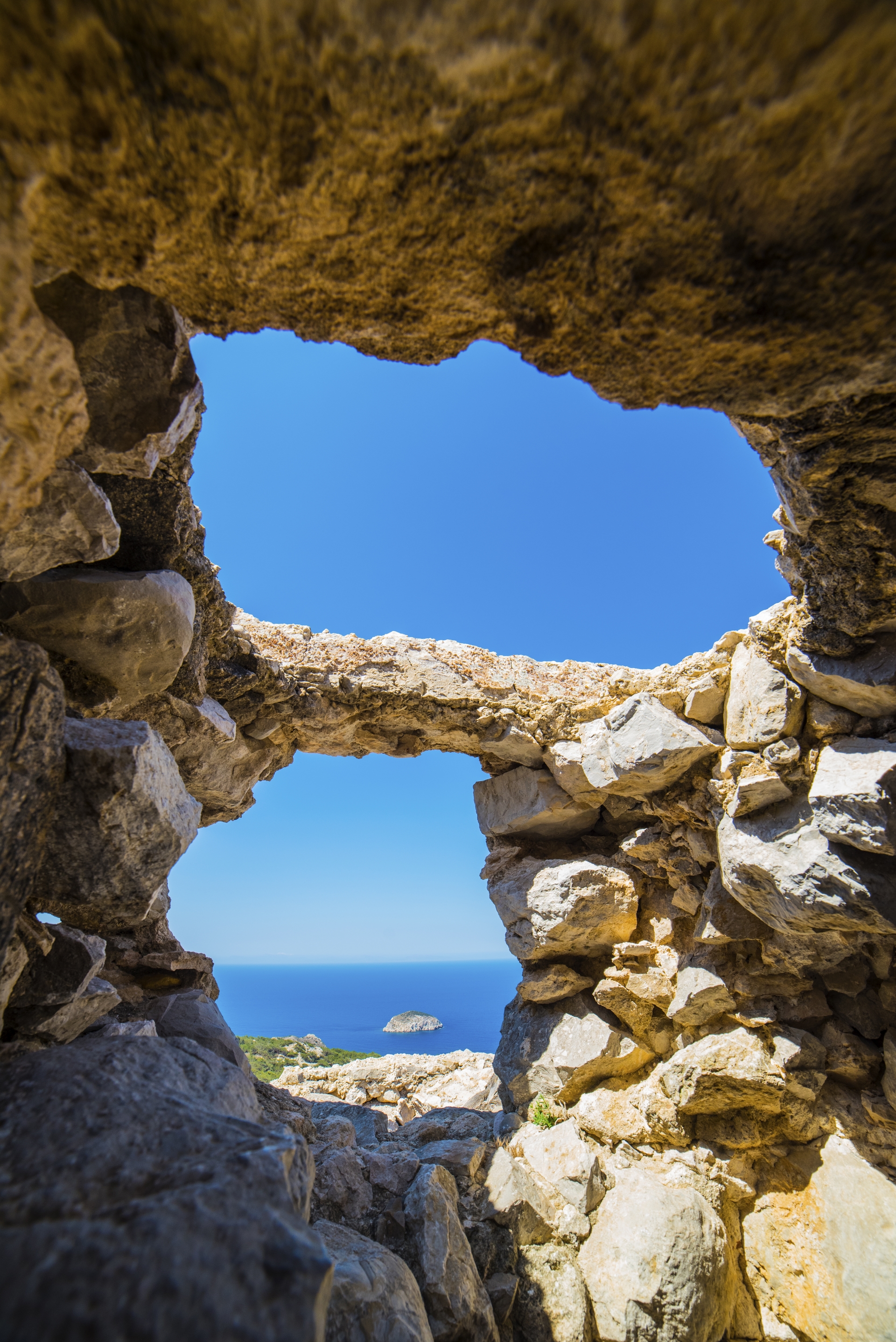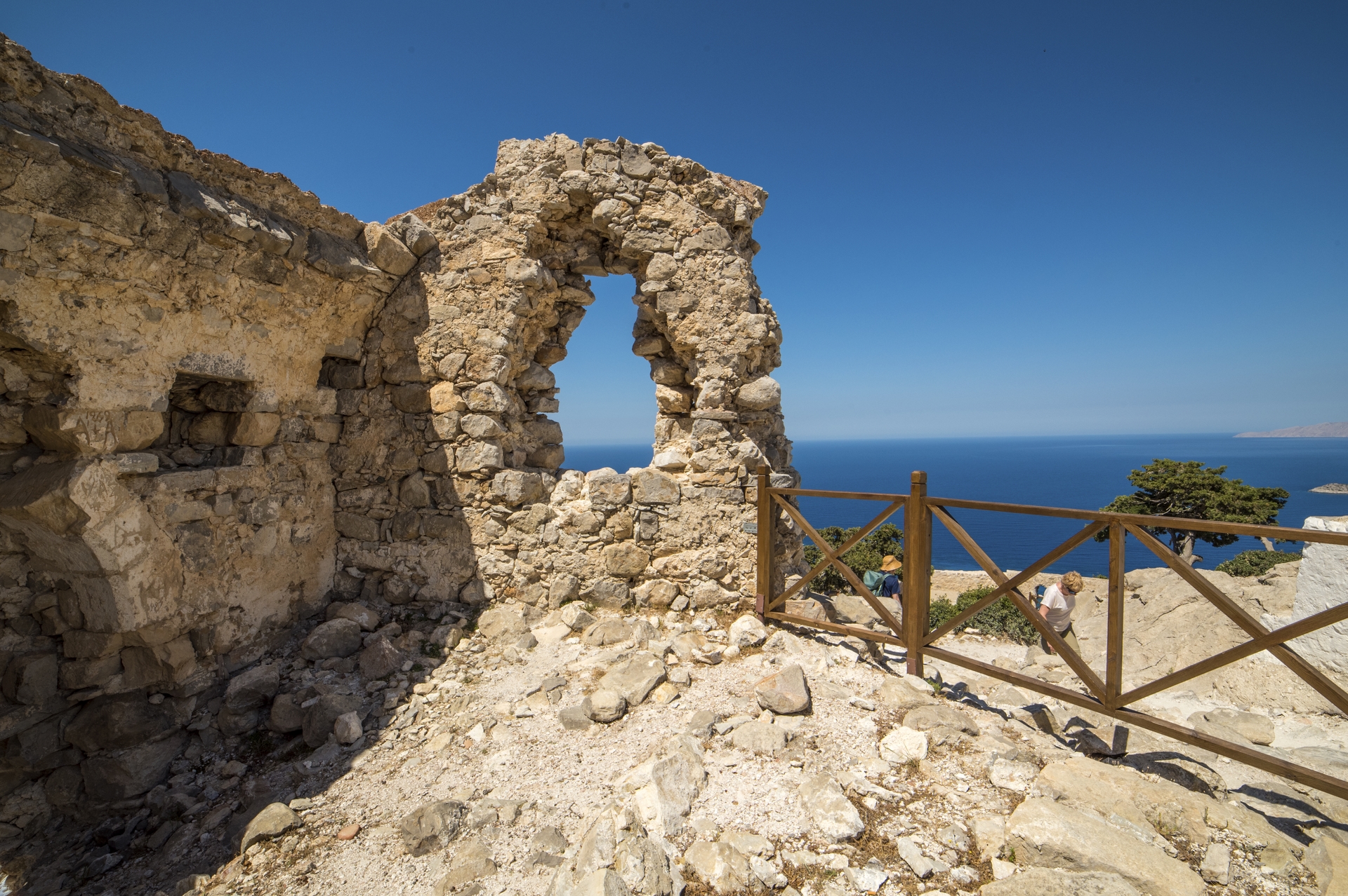 Na zachodnim wybrzeżu warto zatrzymać się przy ruinach zamku w Monolithos. Widok z góry na skaliste wybrzeże i otwarte morze jest jednym z najpiękniejszych na całej wyspie.