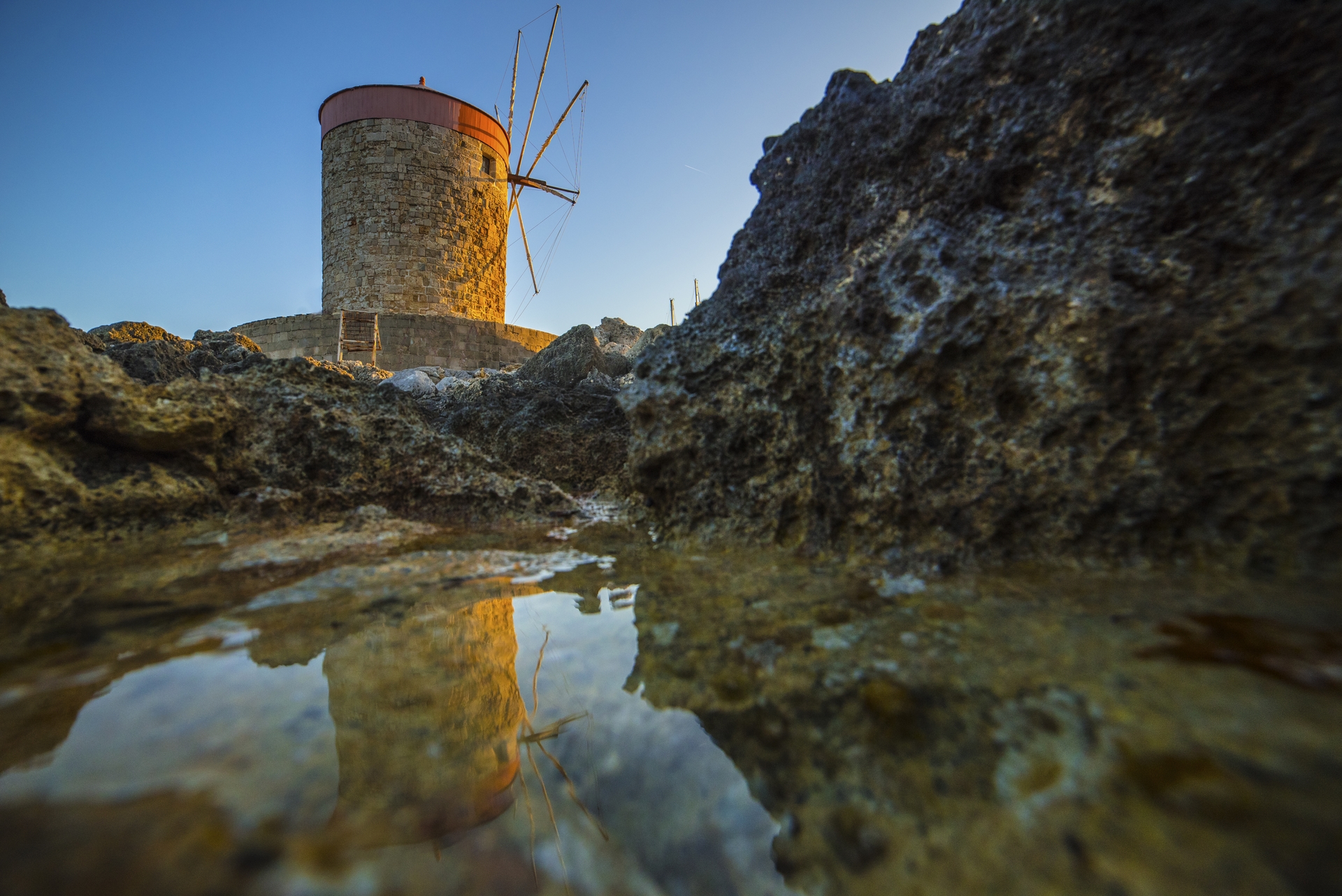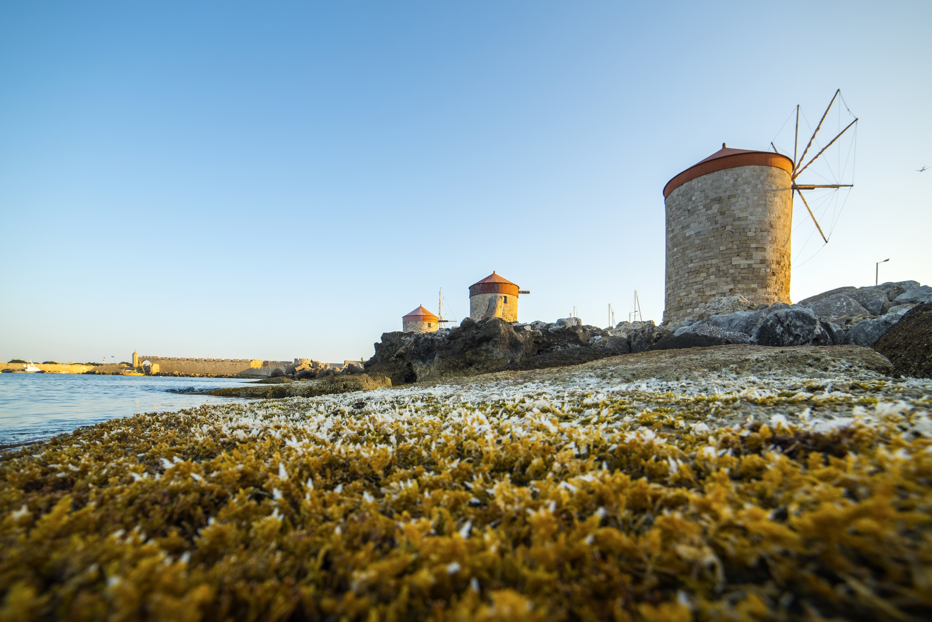 Tuż obok znajduje się port Mandraki, gdzie według legendy stał Kolos Rodyjski – jeden z siedmiu cudów świata starożytnego. Dziś są tu trzy charakterystyczne wiatraki i baszta św. Mikołaja – idealne miejsce na zdjęcia, zwłaszcza o złotej godzinie.