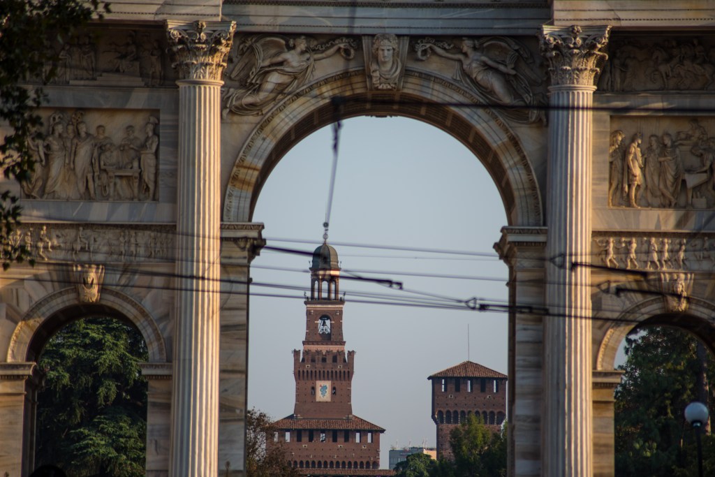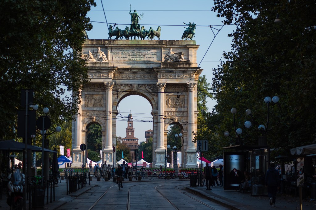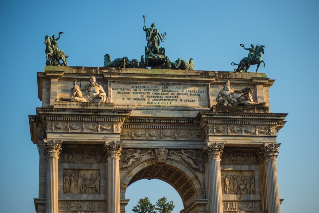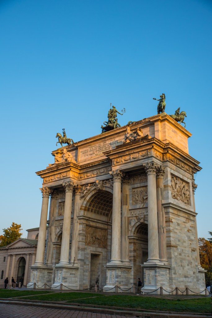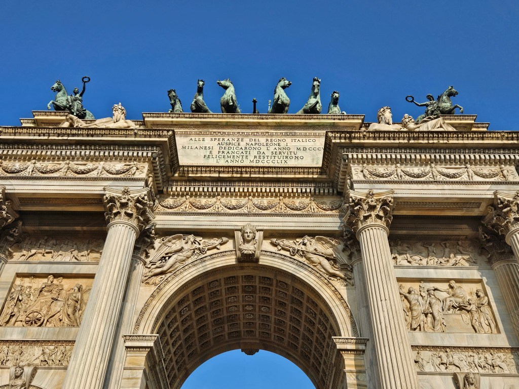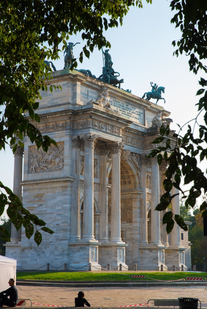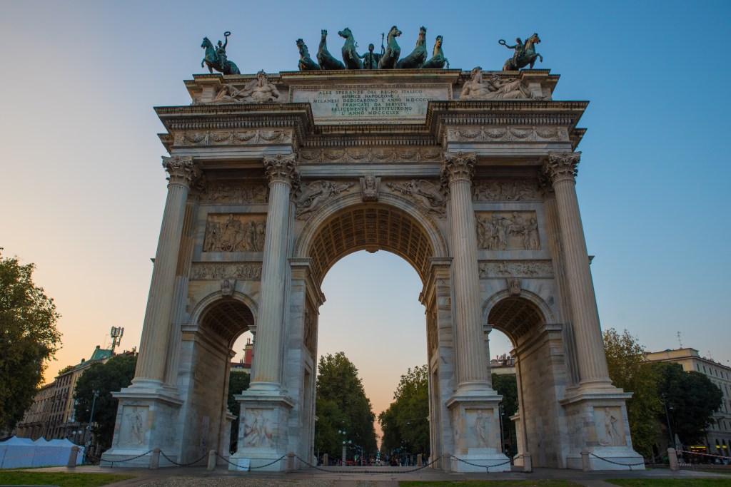 Kilka kroków dalej, za parkiem, stoi Arco della Pace – Łuk Pokoju. Zbudowany z marmuru z tej samej kopalni, co Duomo, wieńczy dawną drogę prowadzącą z Mediolanu do Paryża. To dobre miejsce, by poeksperymentować z kadrami i perspektywą – monumentalna forma i otwarta przestrzeń pozwalają na ciekawe ujęcia z użyciem ludzi w kadrze dla skali.