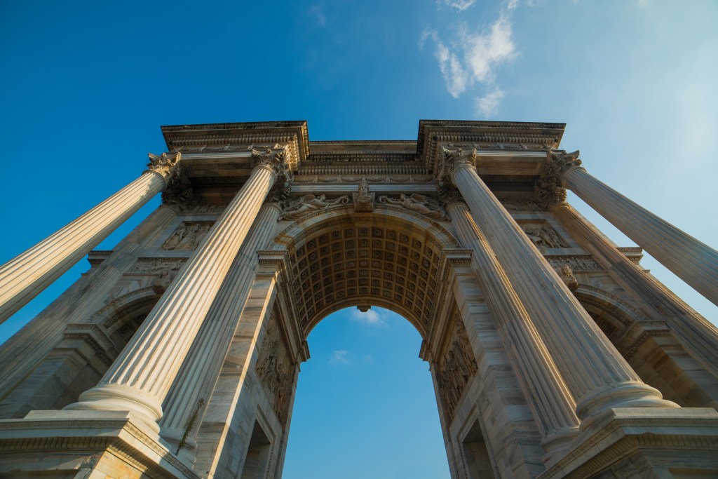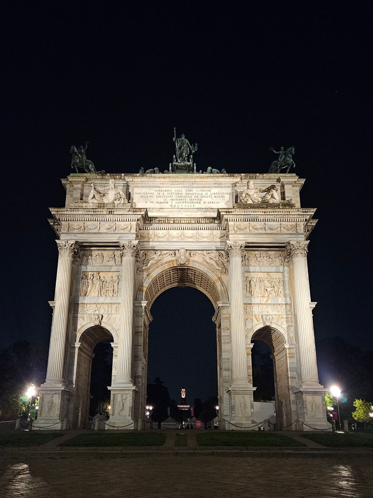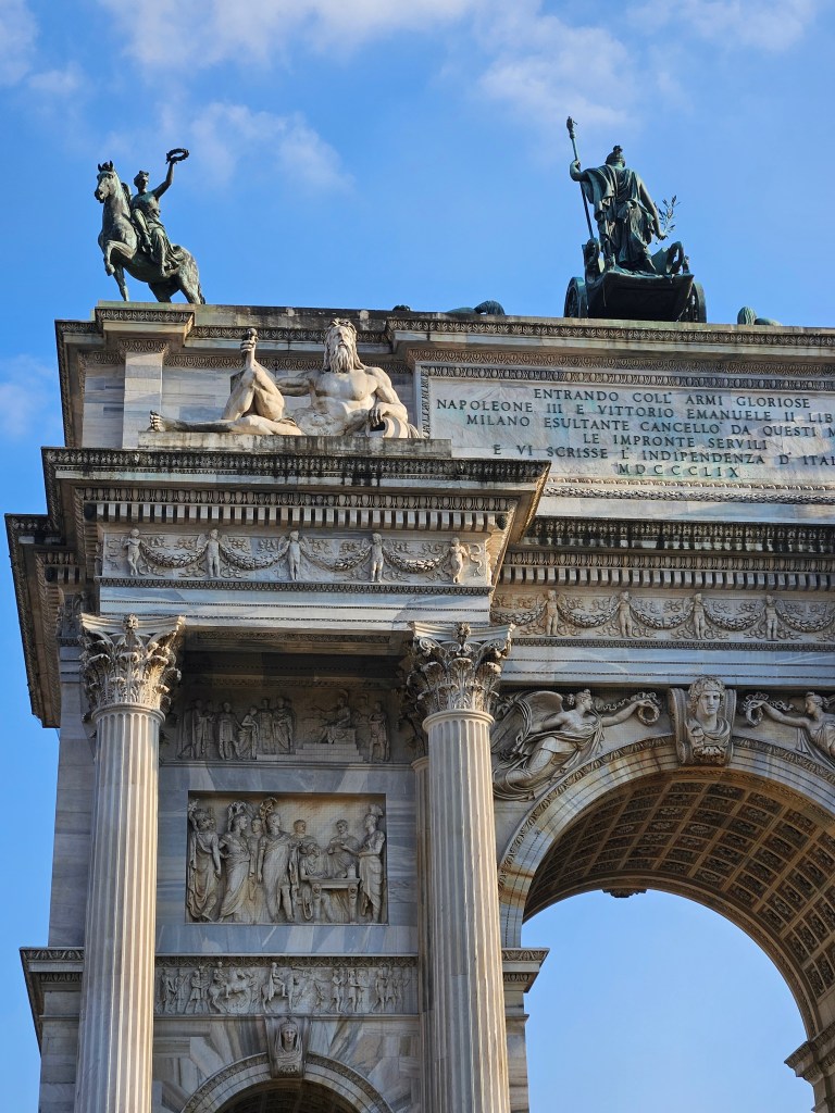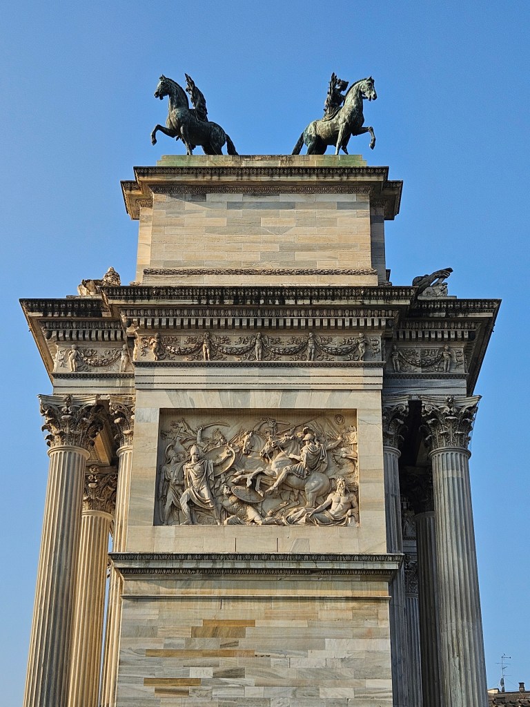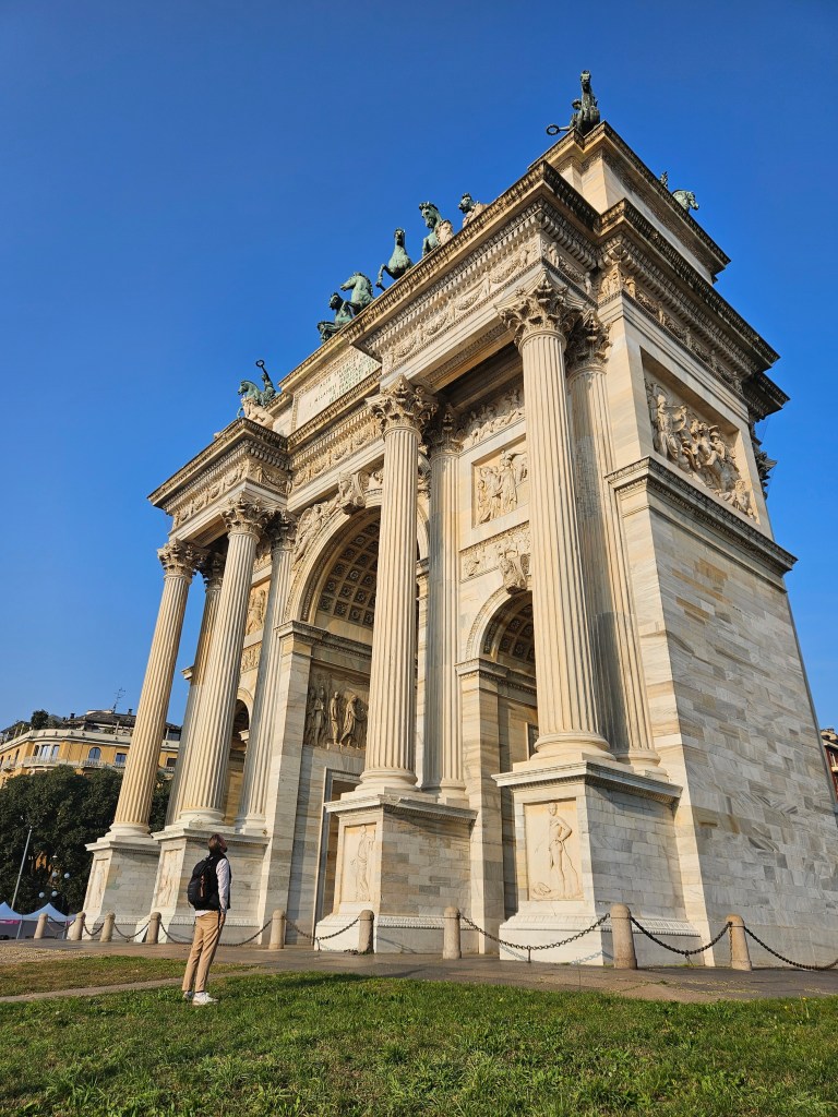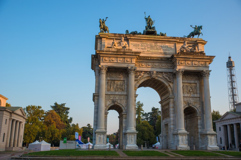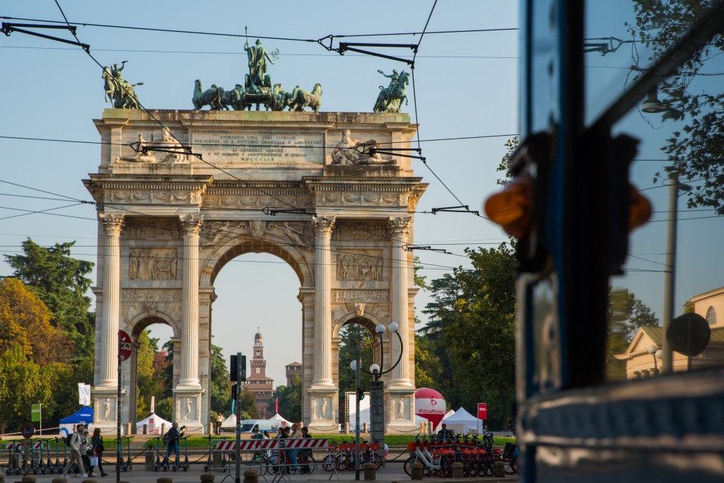 Kilka kroków dalej, za parkiem, stoi Arco della Pace – Łuk Pokoju. Zbudowany z marmuru z tej samej kopalni, co Duomo, wieńczy dawną drogę prowadzącą z Mediolanu do Paryża. To dobre miejsce, by poeksperymentować z kadrami i perspektywą – monumentalna forma i otwarta przestrzeń pozwalają na ciekawe ujęcia z użyciem ludzi w kadrze dla skali.