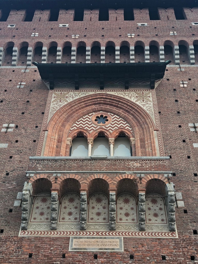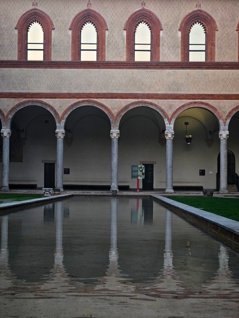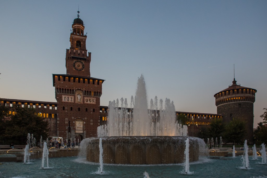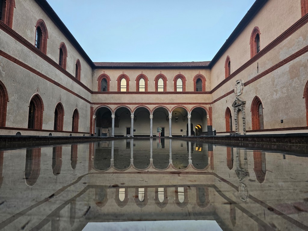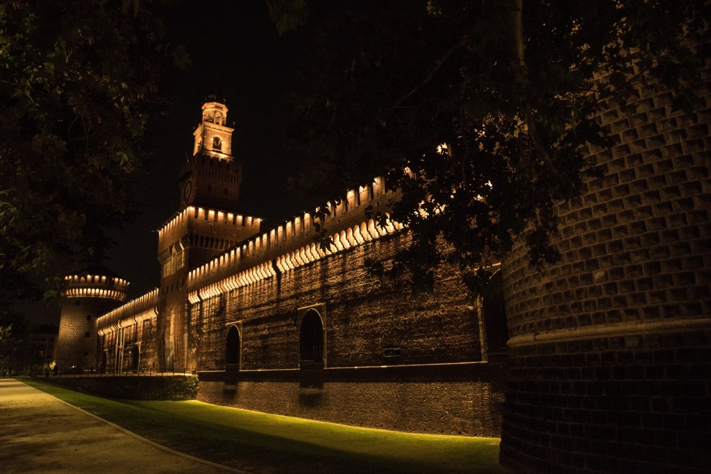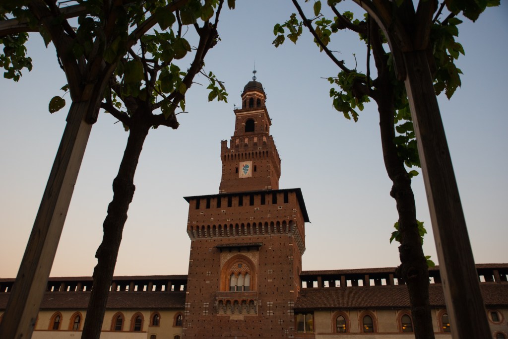 Z galerii kilka minut spacerem dzieli nas od Castello Sforzesco – potężnej fortecy, która przez wieki była rezydencją książąt Mediolanu. Dziś mieści się tu kilka muzeów i dziedziniec, gdzie w cieniu drzew można chwilę odpocząć. Czerwone cegły zamku w połączeniu z zielenią parku Sempione tworzą harmonijną kompozycję kolorów. Przy odpowiednim świetle można uzyskać bardzo plastyczne ujęcia – szczególnie rano, kiedy słońce oświetla mury pod kątem.