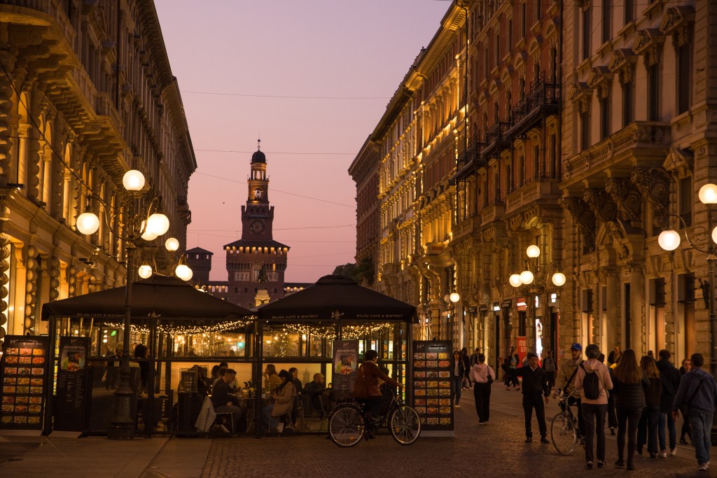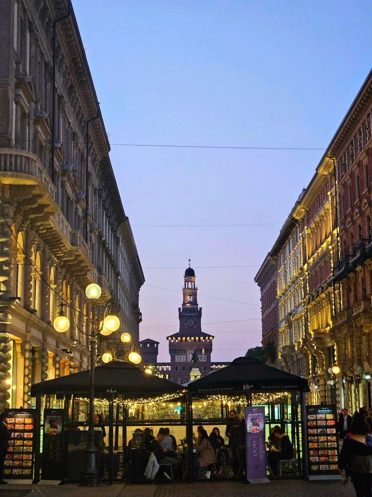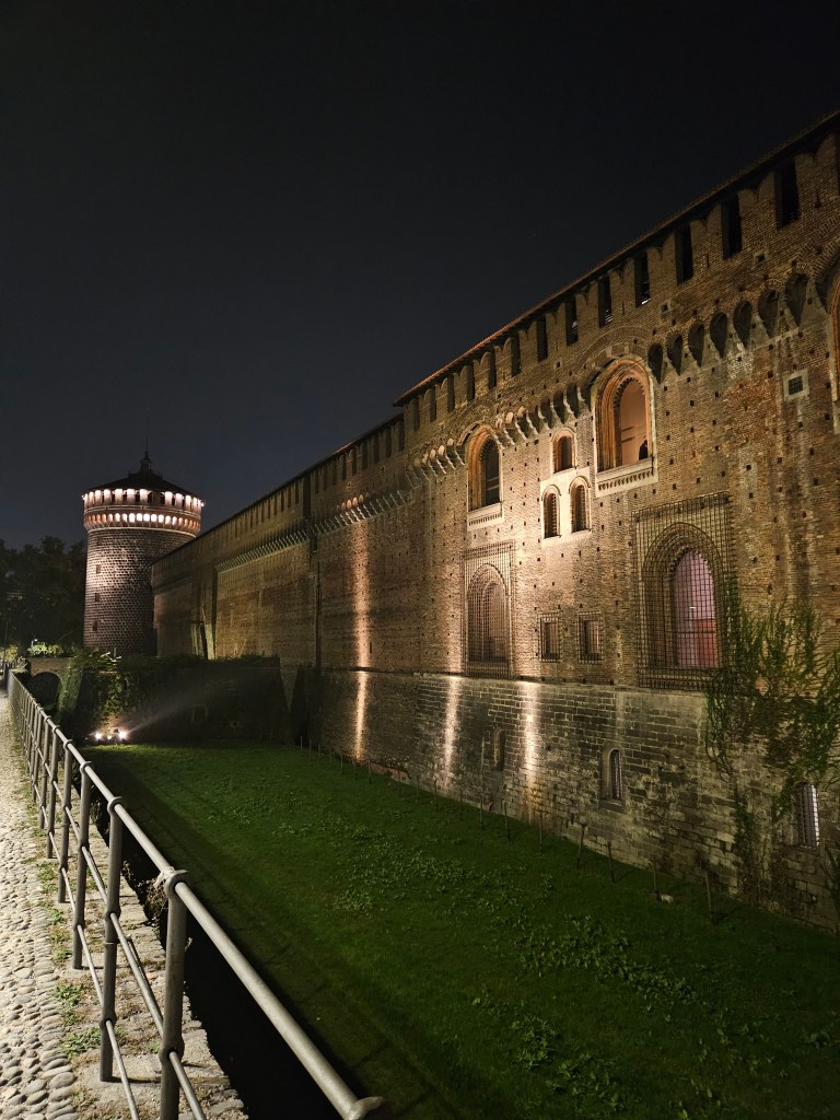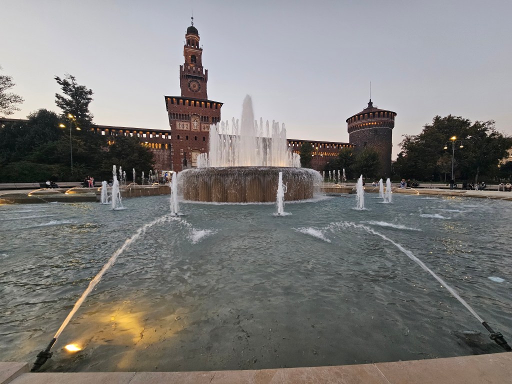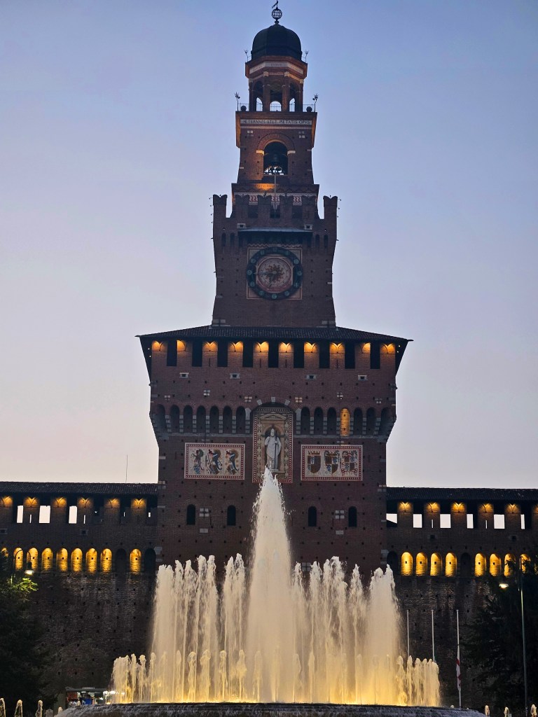Z galerii kilka minut spacerem dzieli nas od Castello Sforzesco – potężnej fortecy, która przez wieki była rezydencją książąt Mediolanu. Dziś mieści się tu kilka muzeów i dziedziniec, gdzie w cieniu drzew można chwilę odpocząć. Czerwone cegły zamku w połączeniu z zielenią parku Sempione tworzą harmonijną kompozycję kolorów. Przy odpowiednim świetle można uzyskać bardzo plastyczne ujęcia – szczególnie rano, kiedy słońce oświetla mury pod kątem.