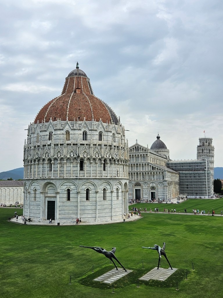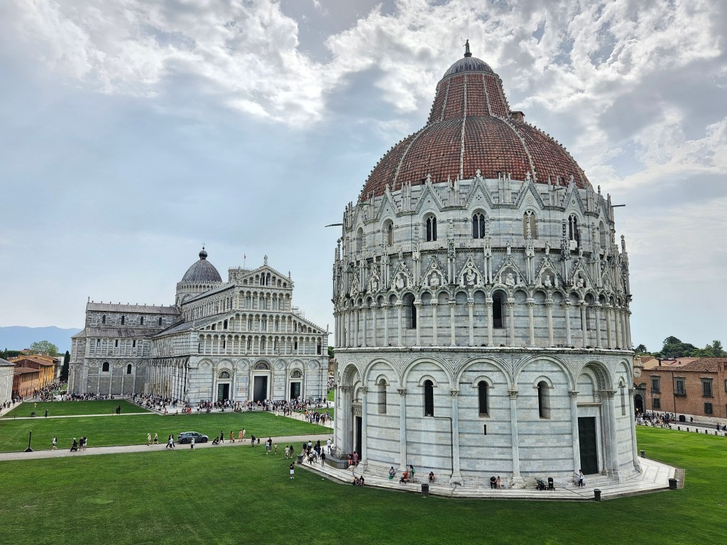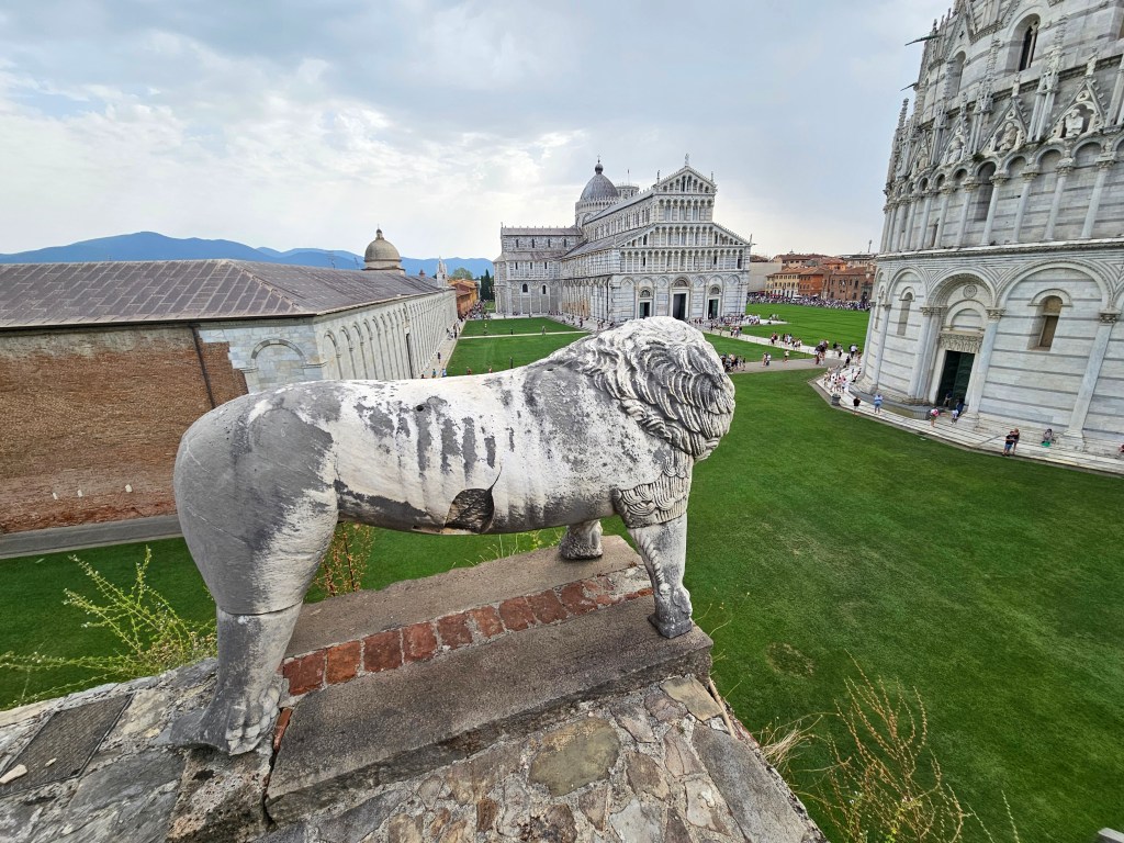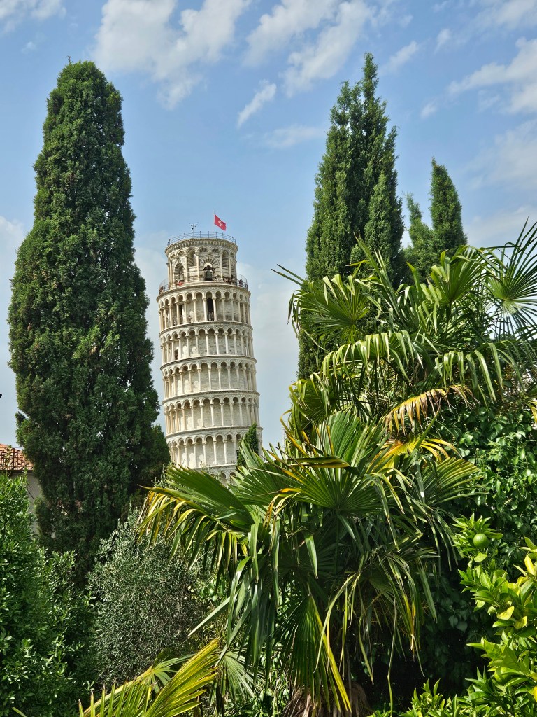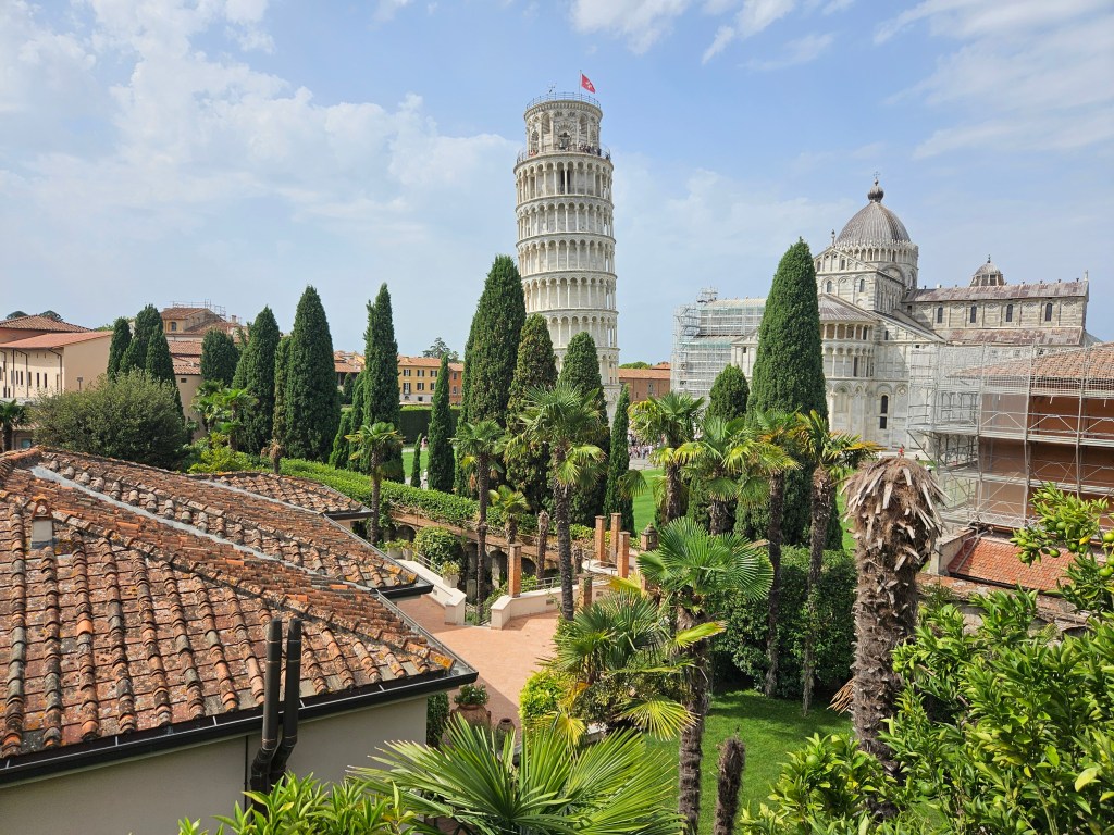 Z tej perspektywy Piza jest zupełnie inna — cicha, uporządkowana, jakby zatrzymana w czasie. Krzywa Wieża widać z góry w pełnej okazałości, ale bez tłumów ludzi u jej stóp.