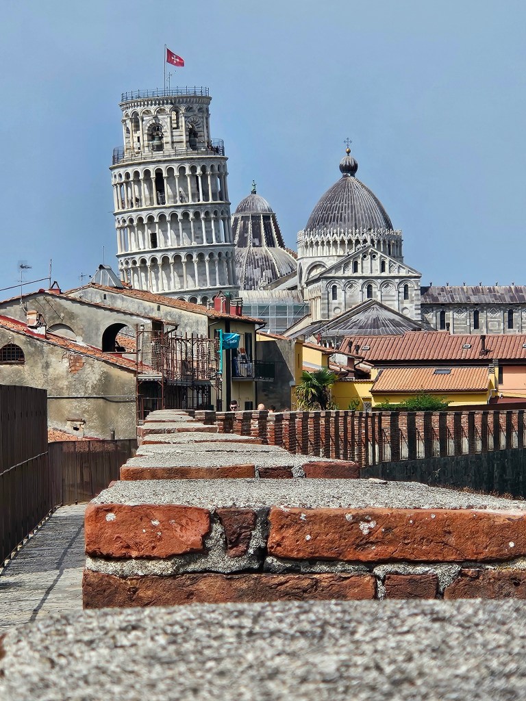Zamiast kolejnego kadru z zatłoczonego placu, warto wejść na mury miejskie (Mura di Pisa). To niezwykła trasa spacerowa ciągnąca się nad miastem, której początki sięgają XII wieku. Bilet można kupić tuż przy rogu placu z Krzywą Wieżą, a wejście prowadzi wprost na starą kamienną ścieżkę biegnącą nad dachami.